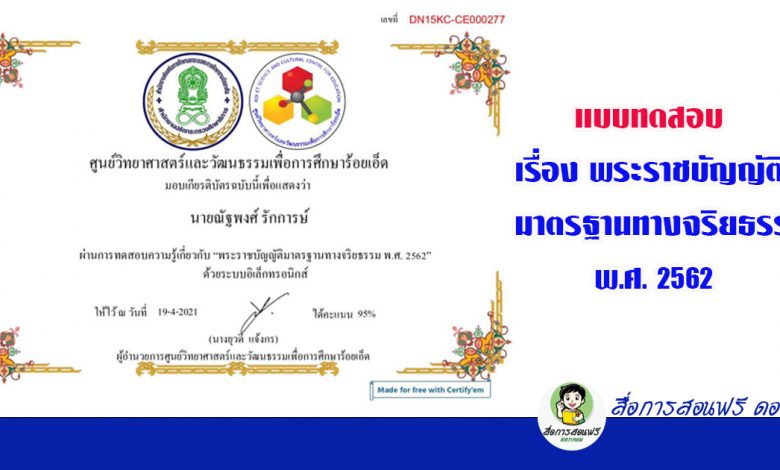 ขอเชิญทำแบบทดสอบ เรื่อง พระราชบัญญัติมาตรฐานทางจริยธรรม พ.ศ. 2562 โดย ศูนย์วิทยาศาสตร์และวัฒนธรรมเพื่อการศึกษาร้อยเอ็ด