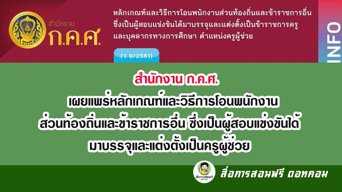 สำนักงาน ก.ค.ศ.เผยแพร่หลักเกณฑ์และวิธีการโอนพนักงานส่วนท้องถิ่นและข้าราชการอื่น ซึ่งเป็นผู้สอบแข่งขันได้ มาบรรจุและแต่งตั้งเป็นครูผู้ช่วย