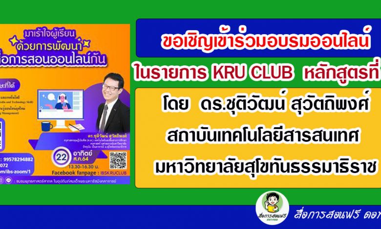 ขอเชิญคุณครู และผู้สนใจเข้าร่วมอบรมออนไลน์ในรายการ KRU CLUB หลักสูตรที่ 2 โดย ดร.ชุติวัฒน์ สุวัตถิพงศ์ สถาบันเทคโนโลยีสารสนเทศ มหาวิทยาลัยสุโขทันธรรมาธิราช