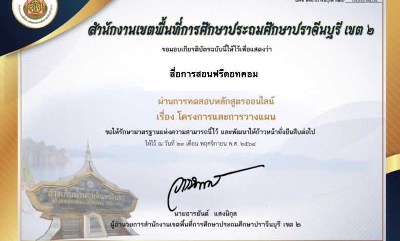 ขอเชิญทำแบบทดสอบออนไลน์หลักสูตรโครงการและการวางแผน ตัวอย่างเกียรติบัตร ทำแบบทดสอบที่นี่