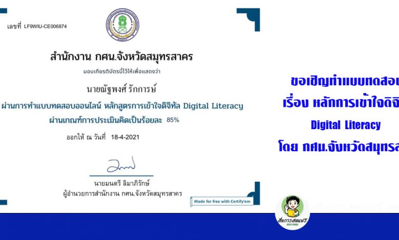 ขอเชิญทำแบบทดสอบออนไลน์ เรื่อง การเข้าใจดิจิทัล Digital Literacy โดย กศน.จังหวัดสมุทรสาคร รับเกียรติบัตรฟรี