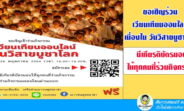 ขอเชิญร่วมเวียนเทียนออนไลน์ เนื่องในวันวิสาขบูชาโลก มีเกียรติบัตรมอบให้ทุกคนที่ร่วมกิจกรรม ลงทะเบียนที่นี่