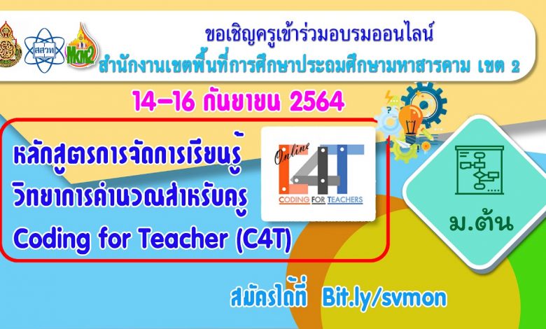 ขอเชิญสมัครอบรมออนไลน์ หลักสูตรการพัฒนาการ จัดการเรียนรู้วิทยาการคำนวณสำหรับครู Coding for Teacher (C4T) ระดับมัธยมศึกษาตอนต้น