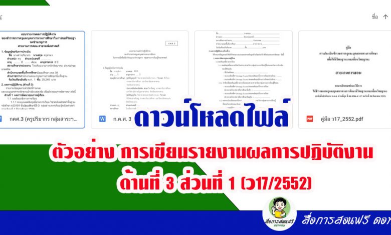 สวัสดีครับคุณครูทุกท่าน วันนี้ สื่อการสอนฟรี ดอทคอม ของเราขอนำเสนอตัวอย่าง การเขียนรายงานผลการปฏิบัติงาน ด้านที่ 3 ส่วนที่ 1 (ว17/2552) ของคุณครูสุพัตรา ศิริบัติ กลุ่มสาระการเรียนรู้วิทยาศาสตร์ โรงเรียนขอนแก่นวิทยายน 3 และ คุณครูปริยากร ครูทำนา กลุ่มสาระการเรียนรู้คณิตศาสตร์ โรงเรียนนายางกลักพิทยาคม
