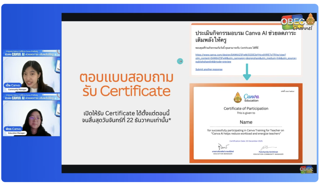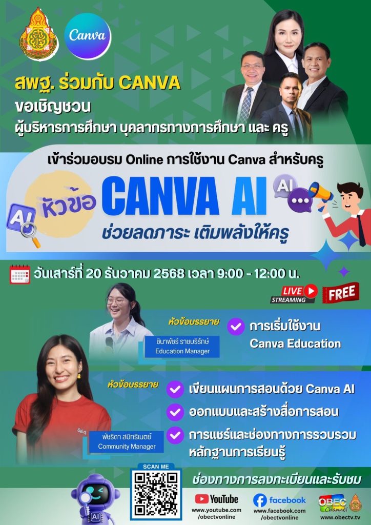 หัวข้อ “Canva AI ช่วยลดภาระเติมพลังให้ครู“ วันเสาร์ที่ 20 ธ.ค. 68 เวลา 09.00 – 12.00 น.