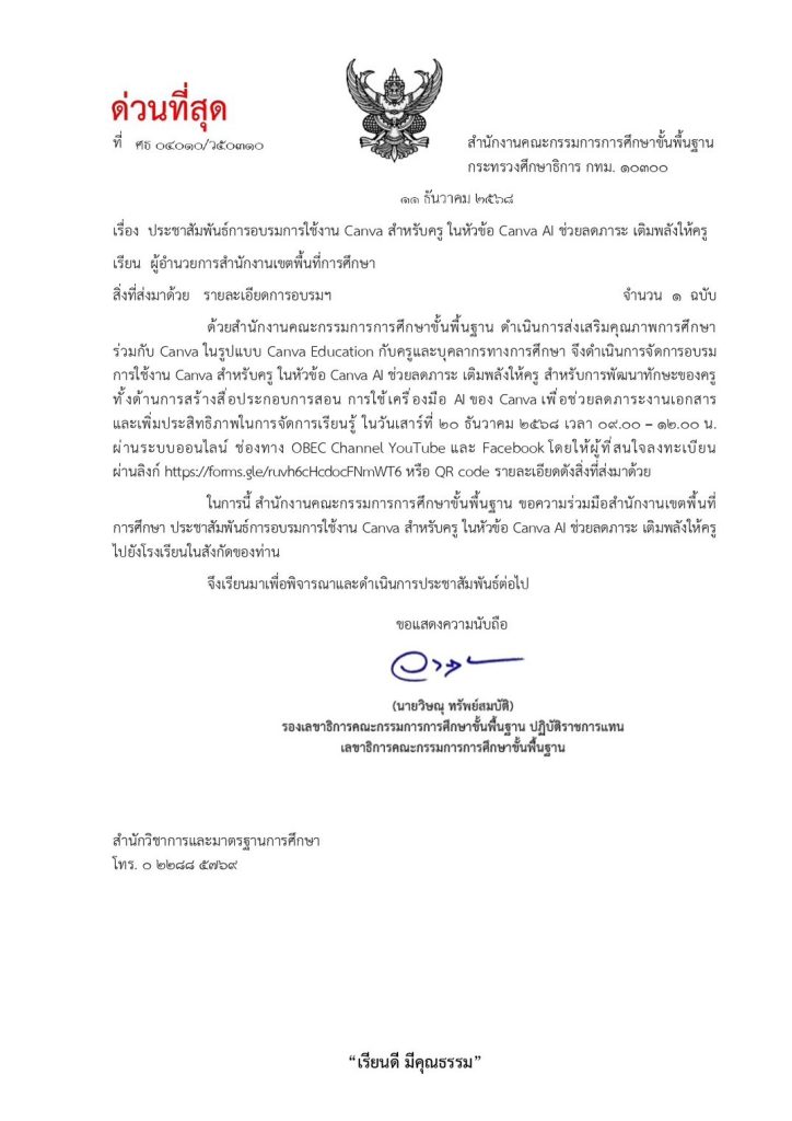 สพฐ. ร่วมกับ CANVA ขอเชิญผู้บริหารการศึกษา บุคลากรทางการศึกษา ครู และผู้สนใจ เข้าร่วมการอบรมออนไลน์ เพื่อเสริมทักษะการใช้ Canva และ AI ในการพัฒนาสื่อการเรียนรู้ ลดภาระงาน และเพิ่มประสิทธิภาพการจัดการเรียนการสอน