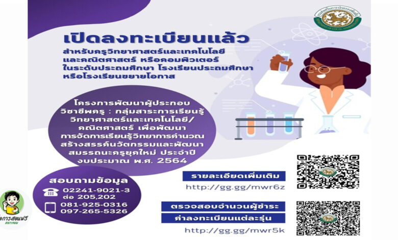 เปิดรับลงทะเบียนแล้ว สำหรับ ครูที่วิทยาศาสตร์และเทคโนโลยี และคณิตศาสตร์ หรือคอมพิวเตอร์ ในระดับประถมศึกษา โรงเรียนประถมศึกษา หรือโรงเรียนขยายโอกาส